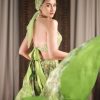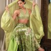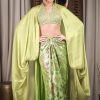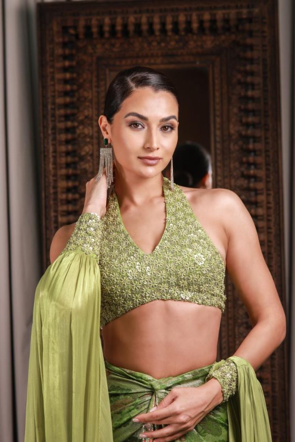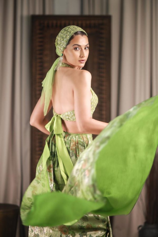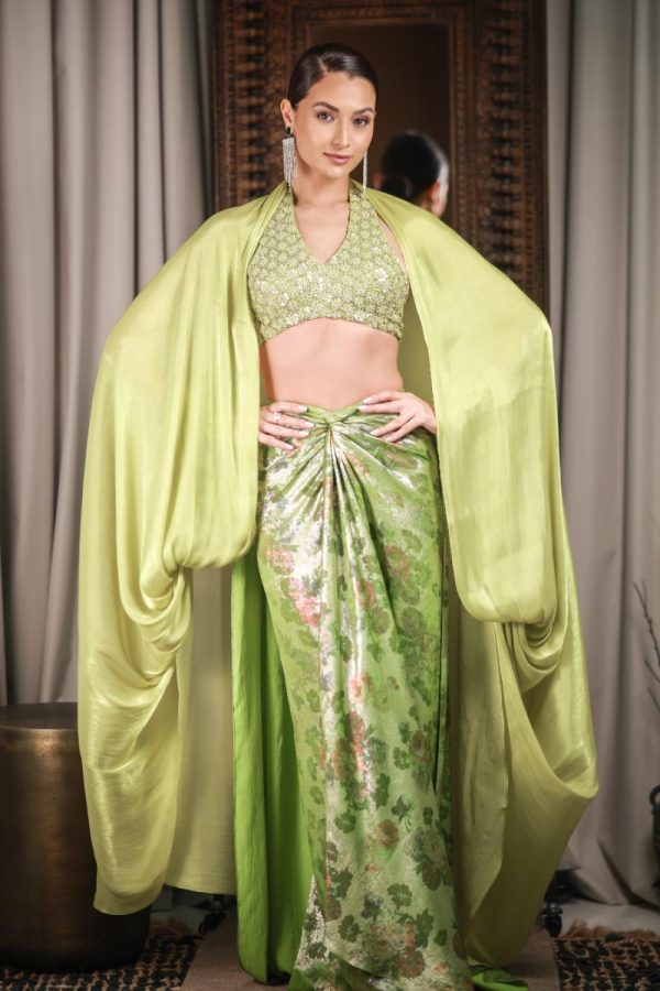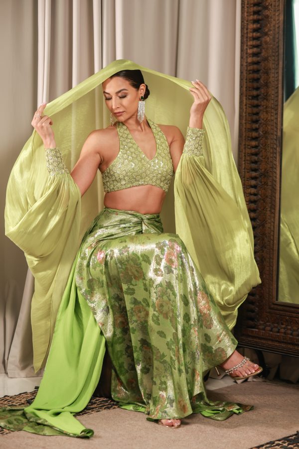 Embroidered halter blouse paired with a floral metallic draped skirt, styled with a matching embroidered headscarf and detachable draped sleeves.