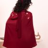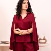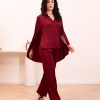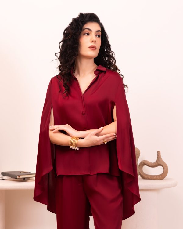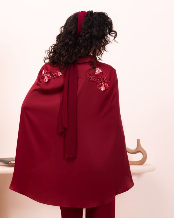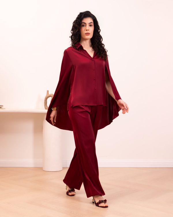 Burgundy cape-sleeve set. Featuring a button-down shirt with dramatic split sleeves, shimmering sequin floral back embroidery, and matching fluid trousers for a sophisticated evening look.