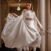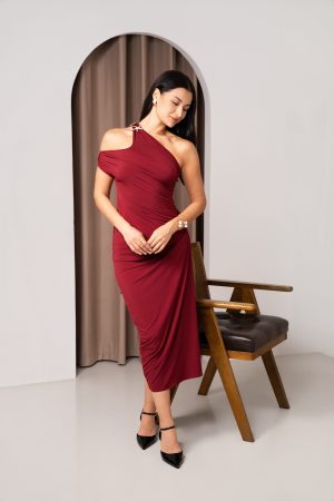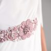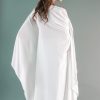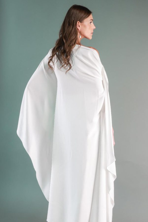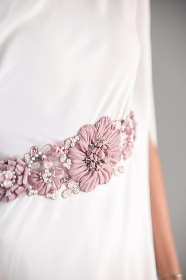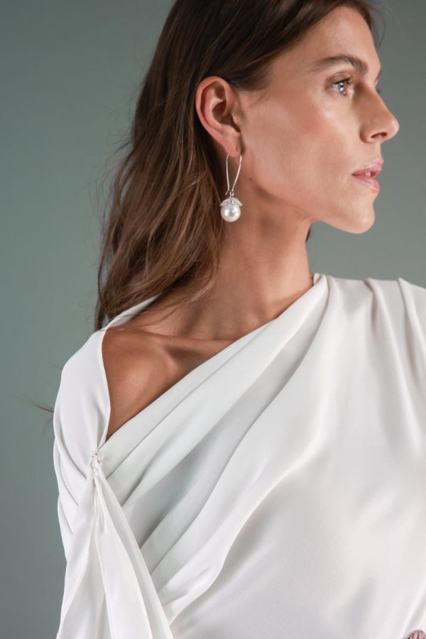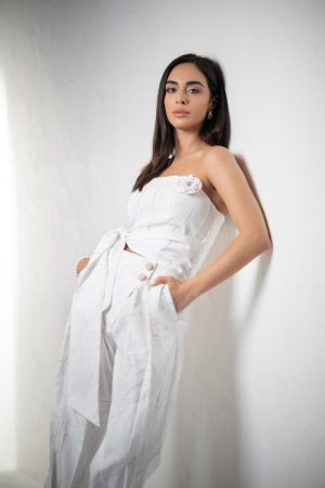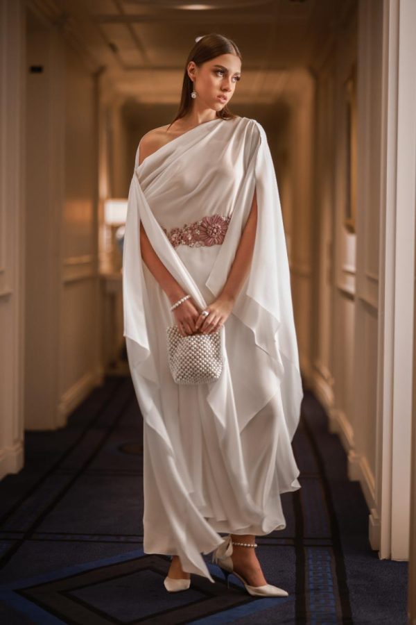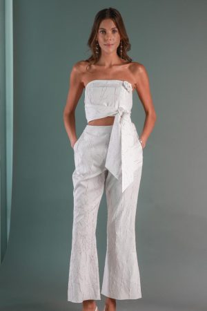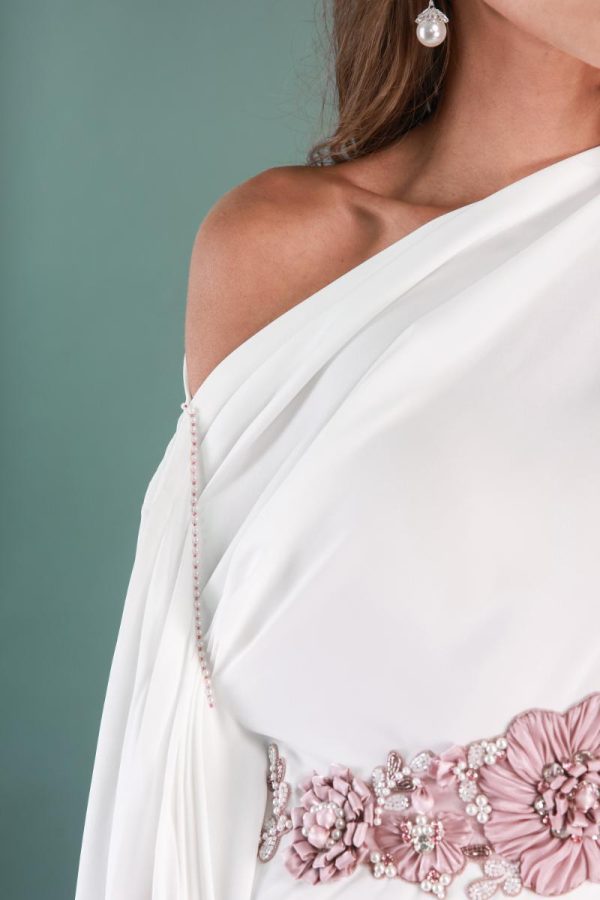 Flowy midi top with white wide flared trousers and soft pink embroidery at the waist.