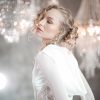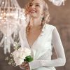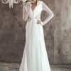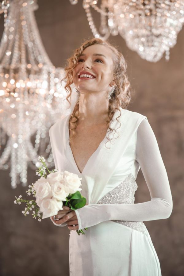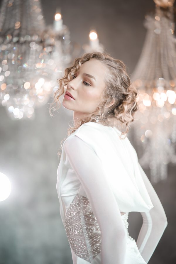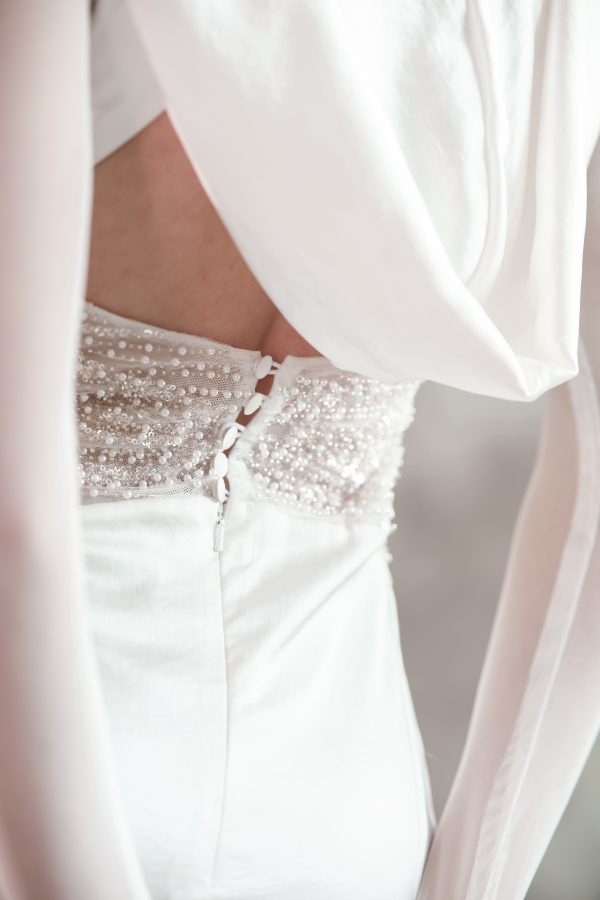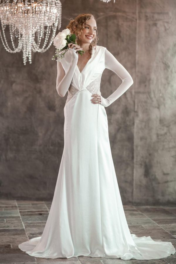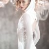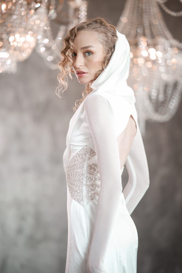 Gown with a draped hood, open back, mesh full length sleeve and embellished bodice.