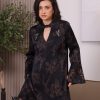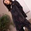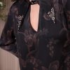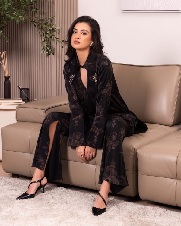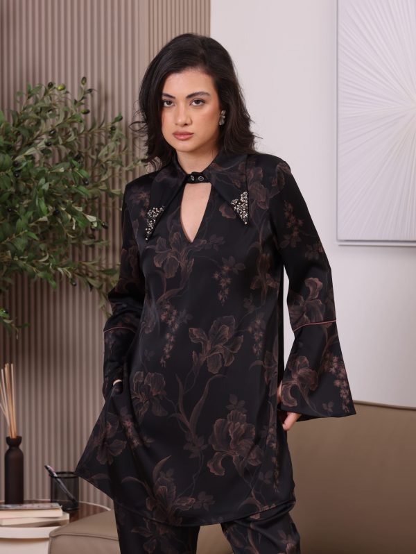 Black floral print tunic with jewel-embellished collar points and matching trousers with dramatic side-split hems.