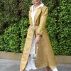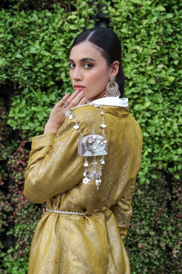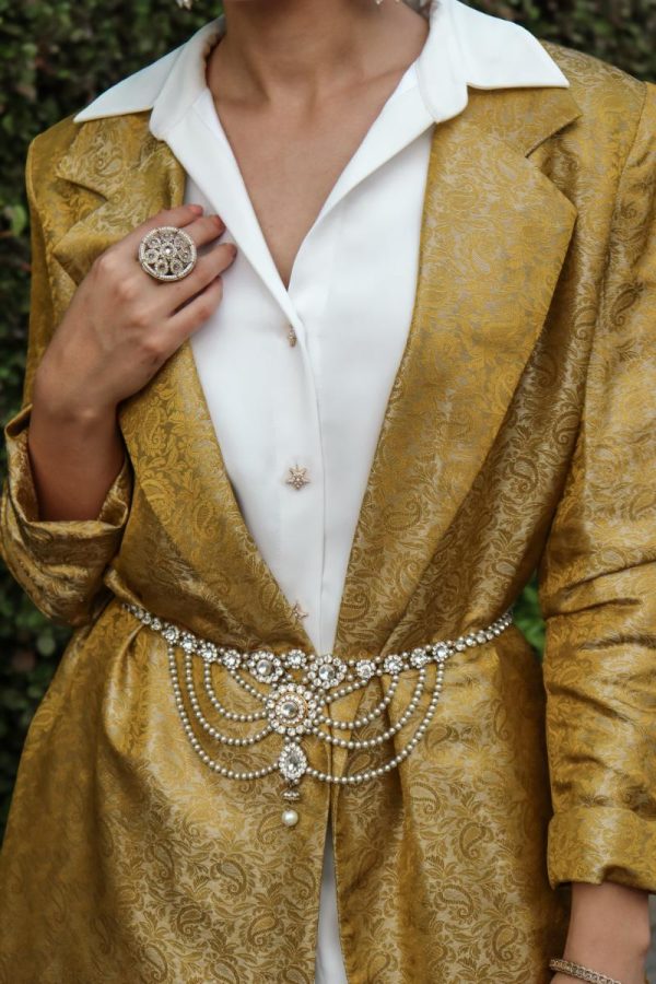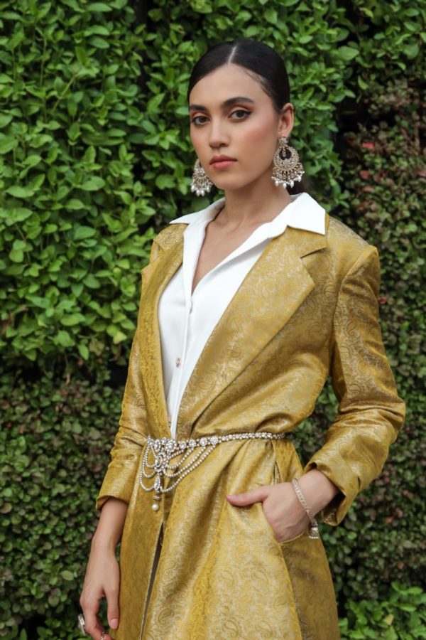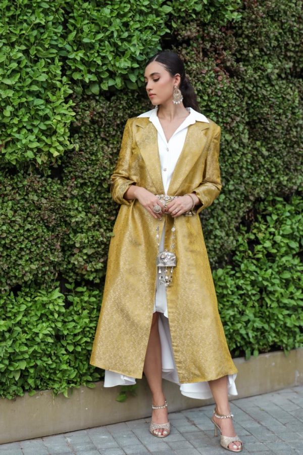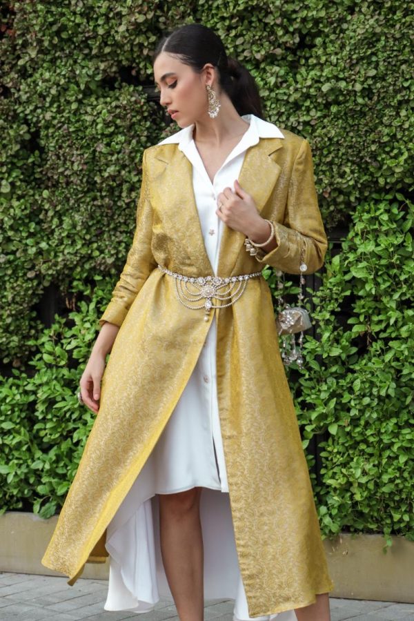 Brocade coat dress layered over an asymmetrical half sleeve white shirt dress