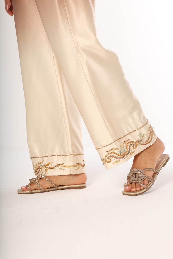 Trouser with elastic waist, side-pockets and hand embroidered border.