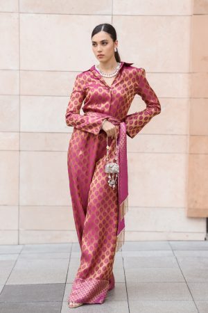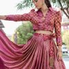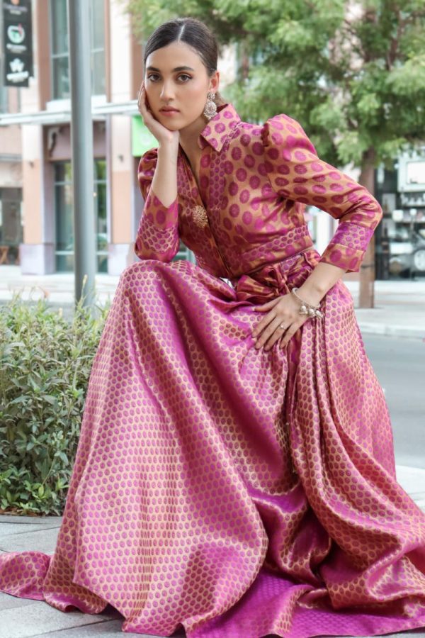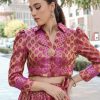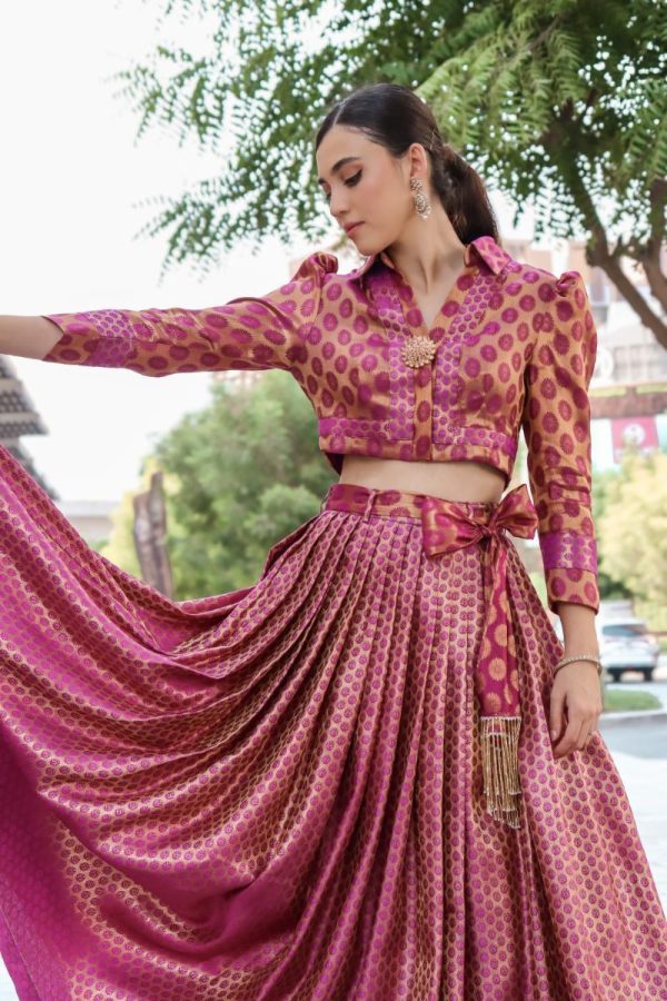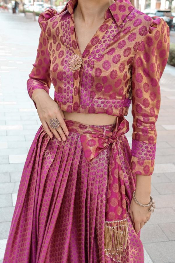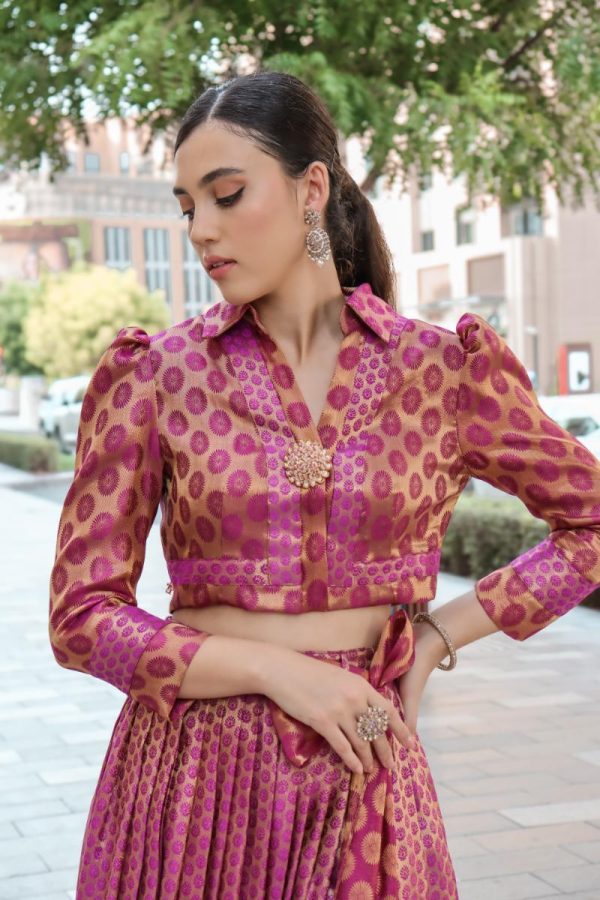 Long flared brocade skirt paired with Puff sleeve brocade crop shirt and a brocade belt
