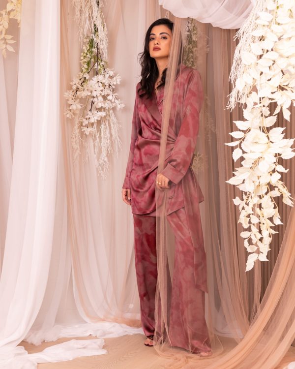 Abstract Print Silk Wrap Set. This contemporary co-ord features a flattering wrap-style tunic and matching wide-leg trousers, perfect for the modern woman seeking a chic, modest transition from day to evening. Experience the soft touch of premium silk in a bold, artistic print.