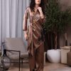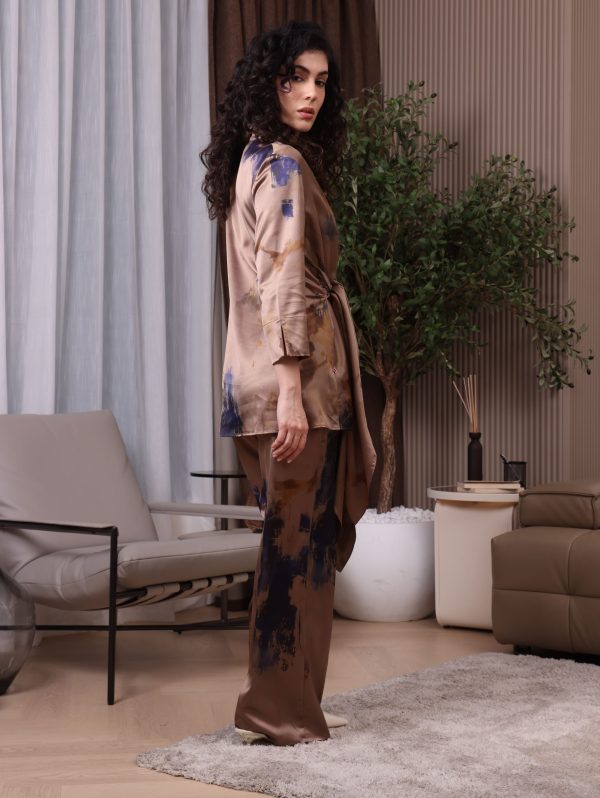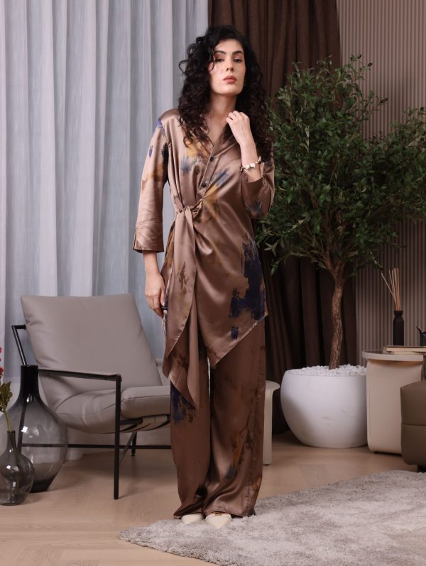 Silk Wrap Co-od Set, featuring a rich, earthy palette and a sophisticated side-tie wrap detail.