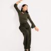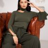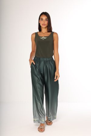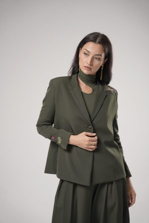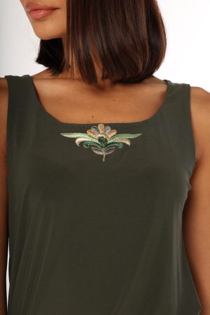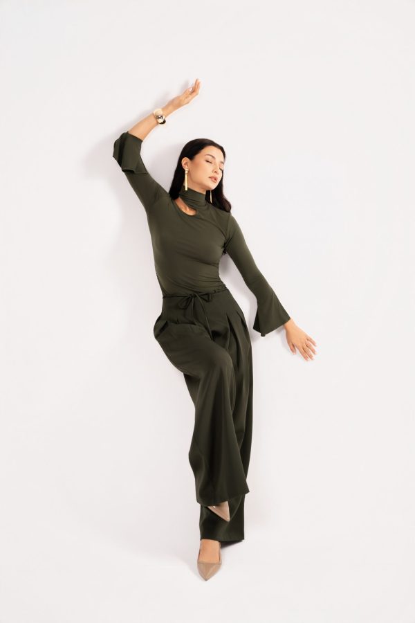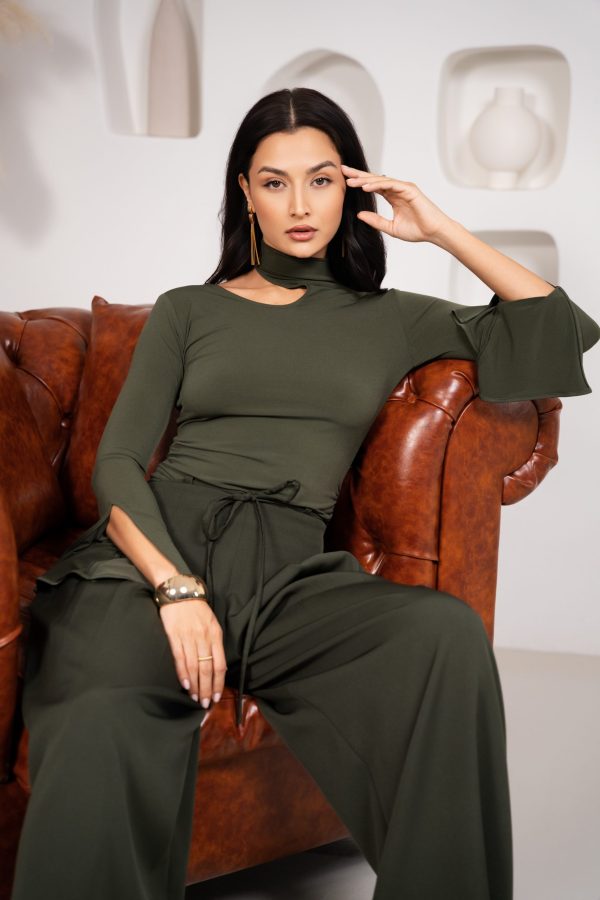 Fitted green stretch top with distinctive neckline design.
